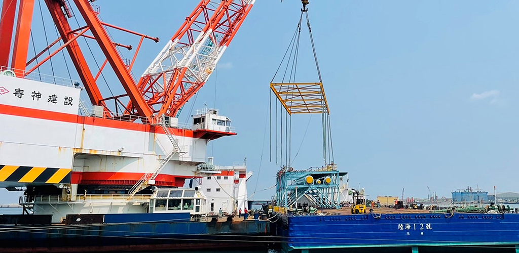 以駁船搭配重件船進行吊裝作業,精確完成大型貨物的裝卸、運輸與安裝定位。