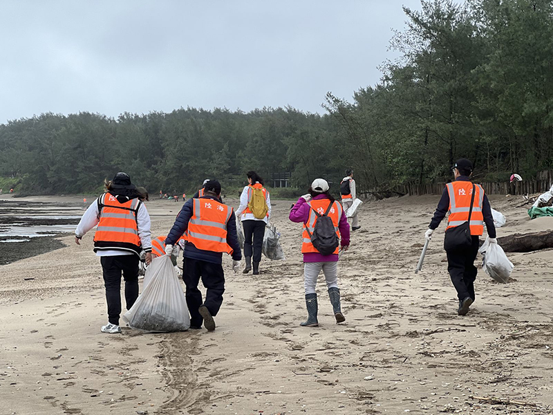 儘管天氣不佳,但陸海公司的員工們仍舊熱情參與,手持夾子、垃圾袋,將散落在沙灘上的各種垃圾一一撿起。從塑膠瓶、保麗龍碎片到漁網,無所不撿。大家齊心協力,為美麗的海岸線盡一份心力。