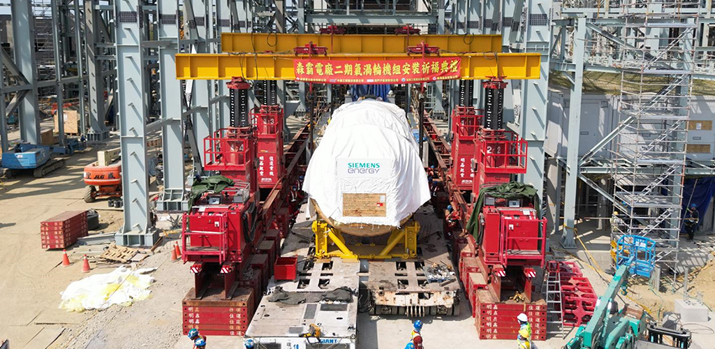 運用多組龍門式起重機,進行發電機組之吊裝作業。