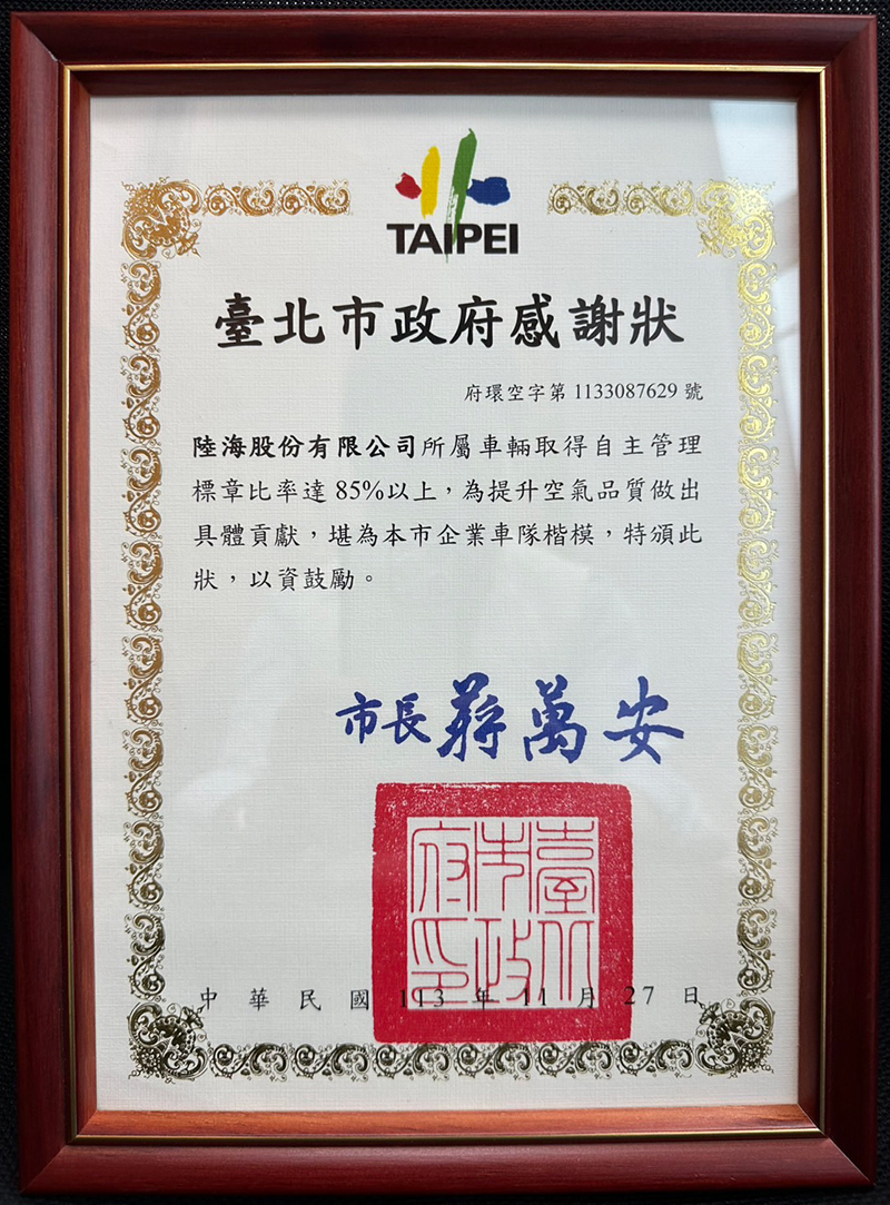 獲台北巿政府頒 企業車隊楷模.